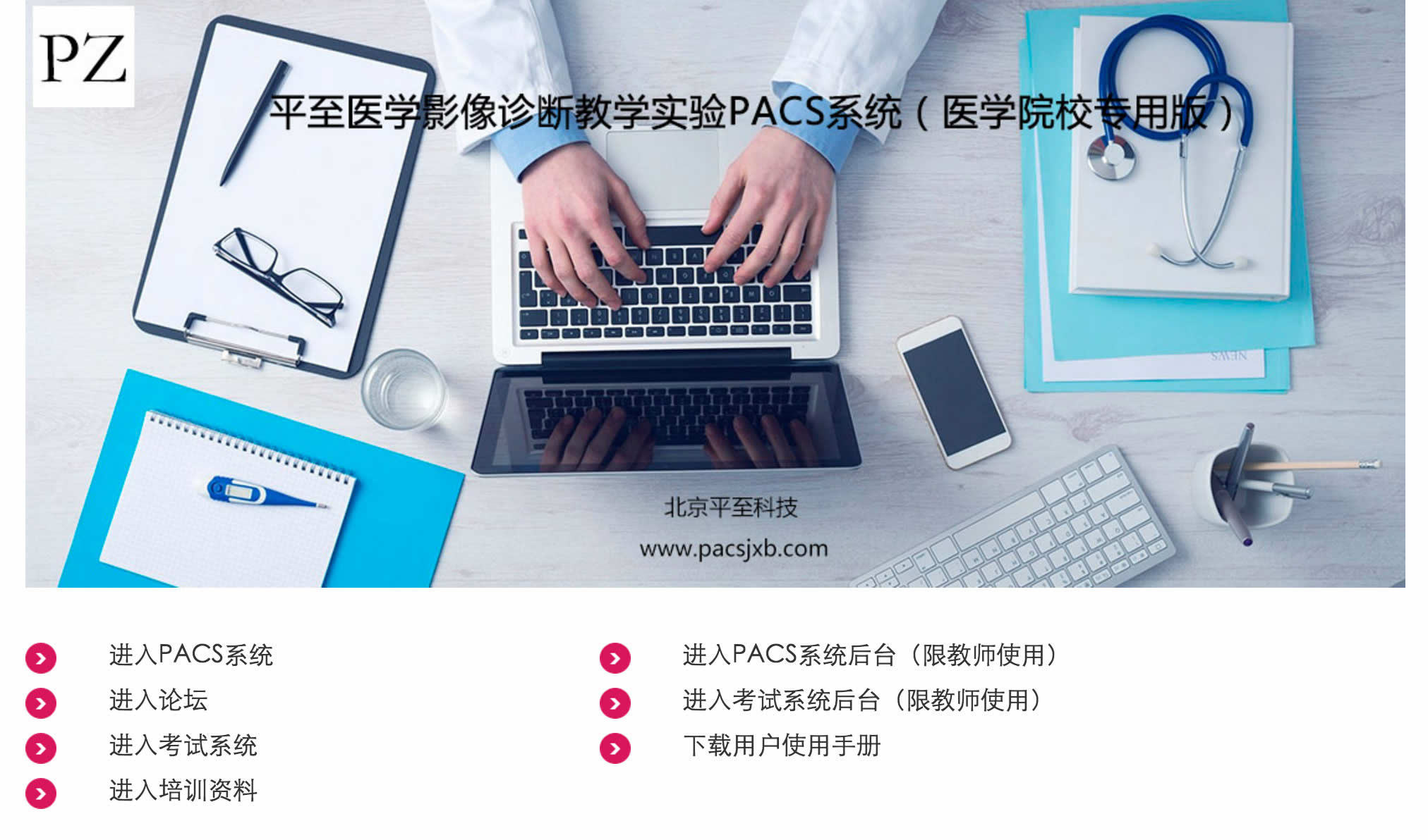 北京平至科技专为医学院校医学影像诊断课程教学实验而量身定做的《平至医学影像诊断教学实验PACS系统(医学院校专用版)》,既具有PACS系统的基本内容,又突出了医学影像诊断课程教学与实验的需求,可组建局域网,又可融合于校园网之中,接口无限量,丰富、优化了教学资源,属PACS系统应用于高校教学实验的首创之作。主要有四大模块组成,一是PACS,二是考试系统,三是教学资料管理,四是师生互动平台。